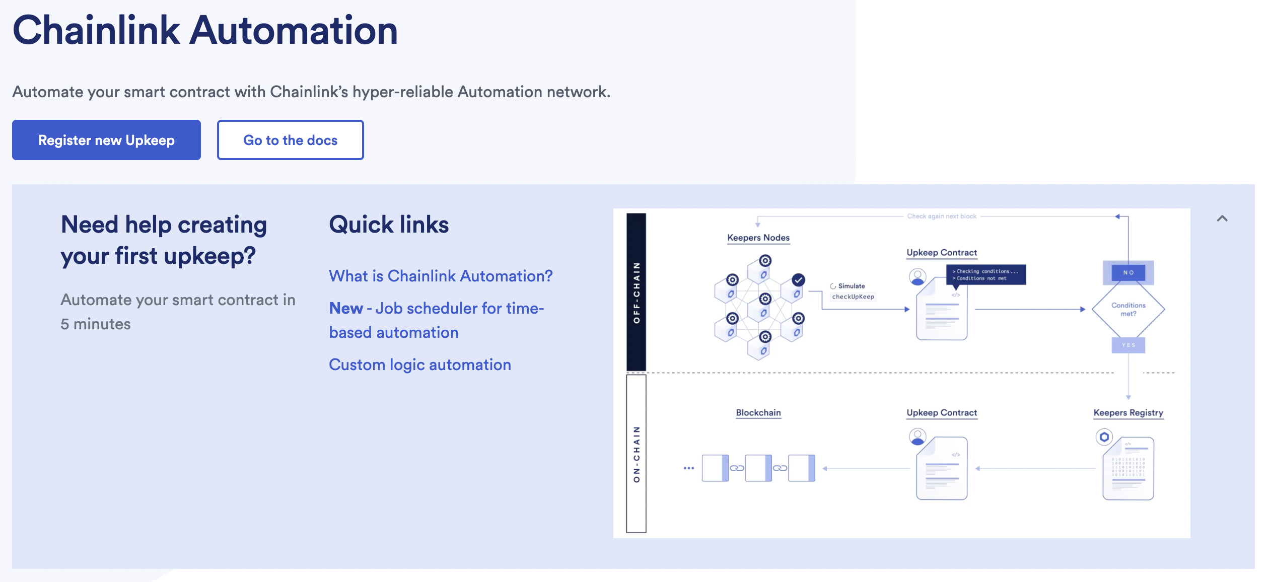 Create powerful automation for your smart contract that leverages custom logic to trigger specified actions. This guide explains how to register a custom logic upkeep that uses a compatible contract. You can register it using the Chainlink Automation App or from within a contract that you deploy.